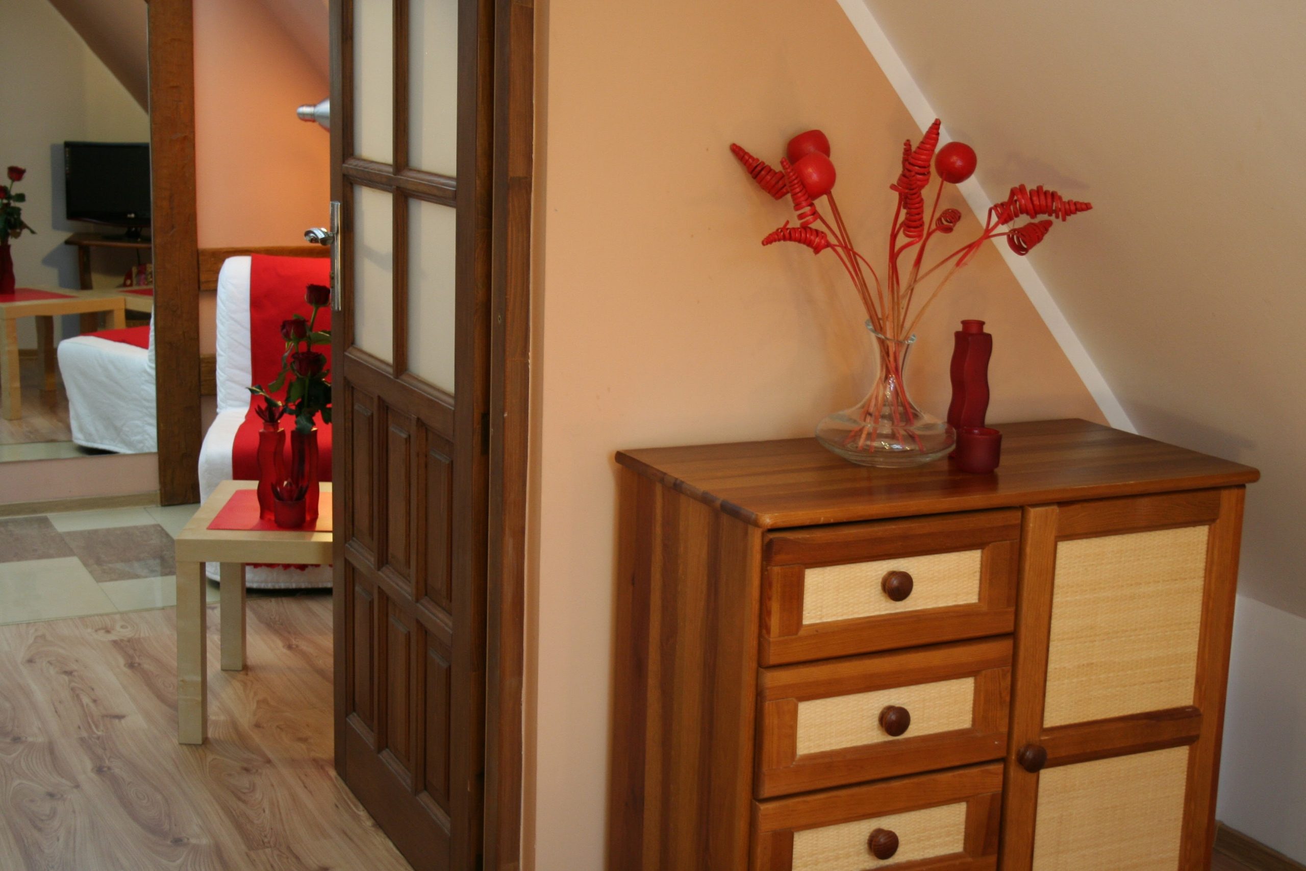 Oto jeden z naszych apartamentów, który zlokalizowany jest w naszym obiekcie przy ulicy Kościuszki 15 w Zakopanem. Apartament ten, o symbolu B4 zajmuje powierzchnię ok. 37 m2 i składa się z pokoju dziennego oraz oddzielnej dwuosobowej sypialni. Apartament posiada łazienkę z WC i prysznicem. W sypialni znajduje się dwuosobowe małżeńskie łóżko. Pokój dzienny posiada w pełni wyposażony w podstawowe przedmioty aneks kuchenny wraz dwupalnikową płytą elektryczną i lodówką w zabudowie meblowej, stół dla 3 osób., cześć wypoczynkową z RTV. W pokoju dziennym znajduje się również pojedyncza rozkładana sofa do spania. Apartament ten posiada skośne ściany charakterystyczne dla kondygnacji w dachu. Nastrojowy kominek umili Państwu chwile spędzone w tym apartamencie. Do dyspozycji gości bezpłatny dostęp do sieci Wi-Fi oraz oddalone o 250 m miejsce parkingowe dla samochodu. Maksymalnie w tym apartamencie mogą być zakwaterowane cztery osoby.